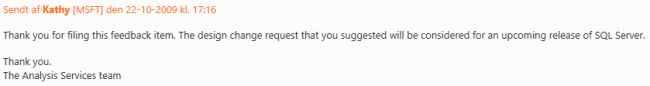 Yes, you may argue that MDX is slowly being replaced by DAX. But I predict (seems oh so popular these days) that SSASMD cubes and MDX will stick around for quite some time still. And you may have a point in that this might not even be up to the Analysis Services Team anymore – since the break up of SSMS and SQL Server releases, the responsibility for this feature request was probably dropped between two chairs – that’s why one could hope that the MSSQL Tiger Team was made aware of this request, because it really seems to have been forgotten. If not for this reply I got on Twitter: